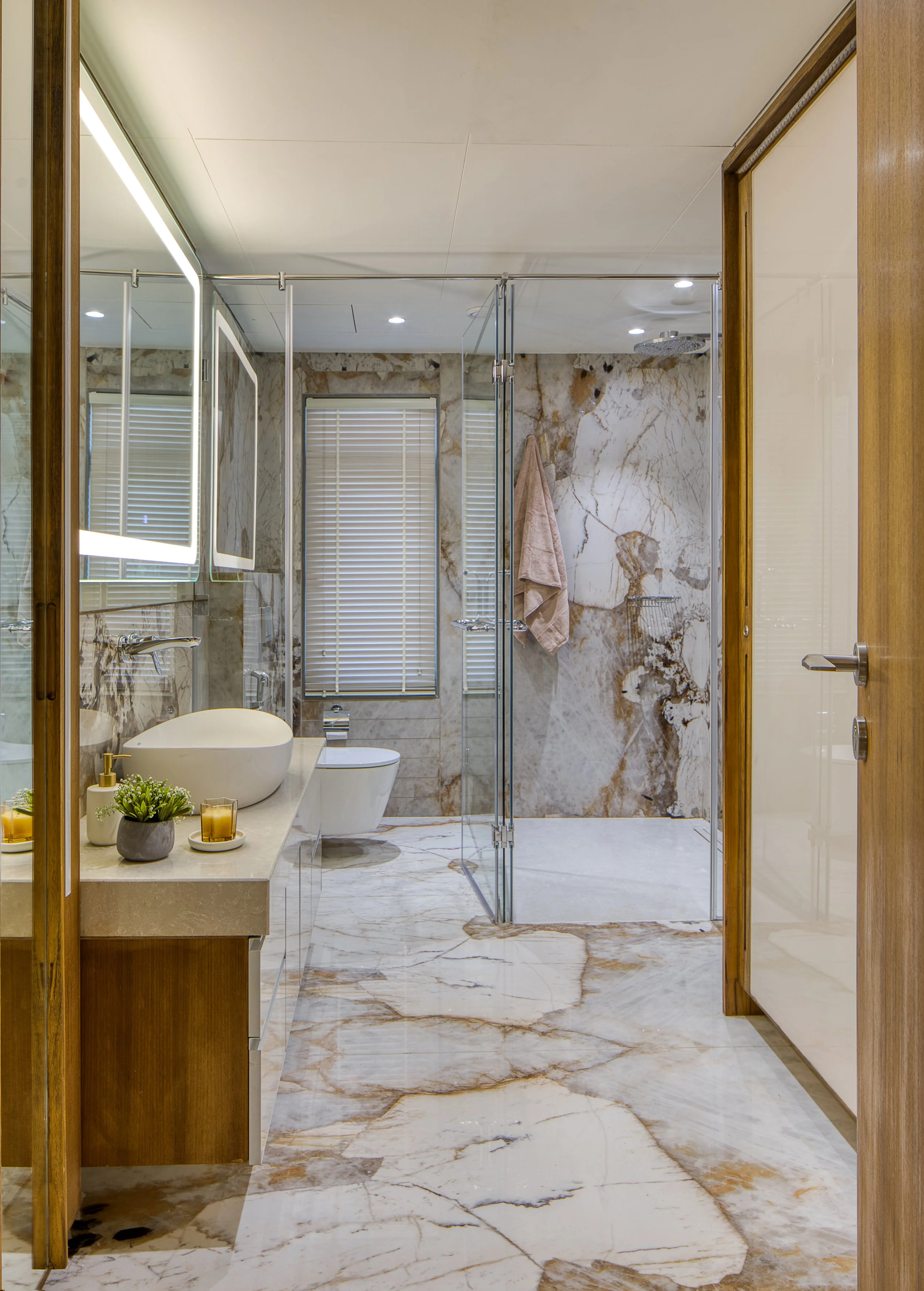 The shades of ivory and beige suit perfectly to make the space feel light. The pastel shades of blue and green intentionally drive focus on other elements. The statement piece in a contrasting color adds visual interest—and an energizing element of surprise to an otherwise streamlined scheme. The similar tones feel almost like a picture and the setting grows into a very calm and soothing state. All automated lights and ambience moods pre-designed in the entire house is the new mantra to relieve stress. All available at your fingertip ,and accessed through ALEXA!